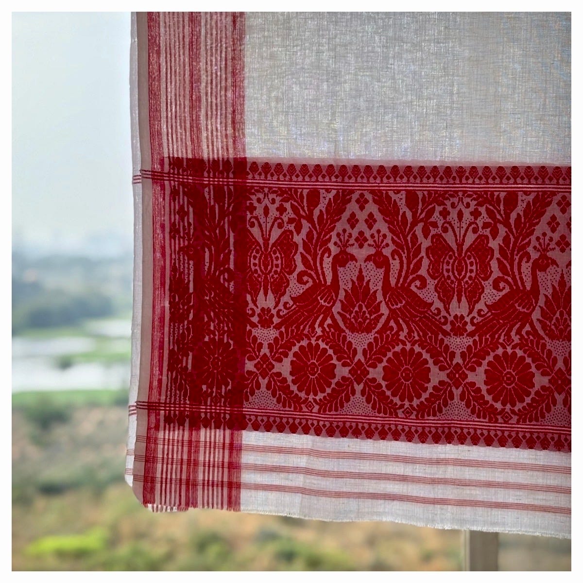 One of the most cherished symbols of Assamese weaving is the Gamusa (pronounced gahmoo-sa). A rectangular piece of cloth, woven with white and red cotton threads, it’s far more than just fabric. Offering a Gamusa to a guest is a time-honored tradition in Assam, symbolizing respect, warmth, and hospitality. Draped over a guest’s neck, it becomes a token not just of their welcome, but of Assam’s deep spirit of generosity.